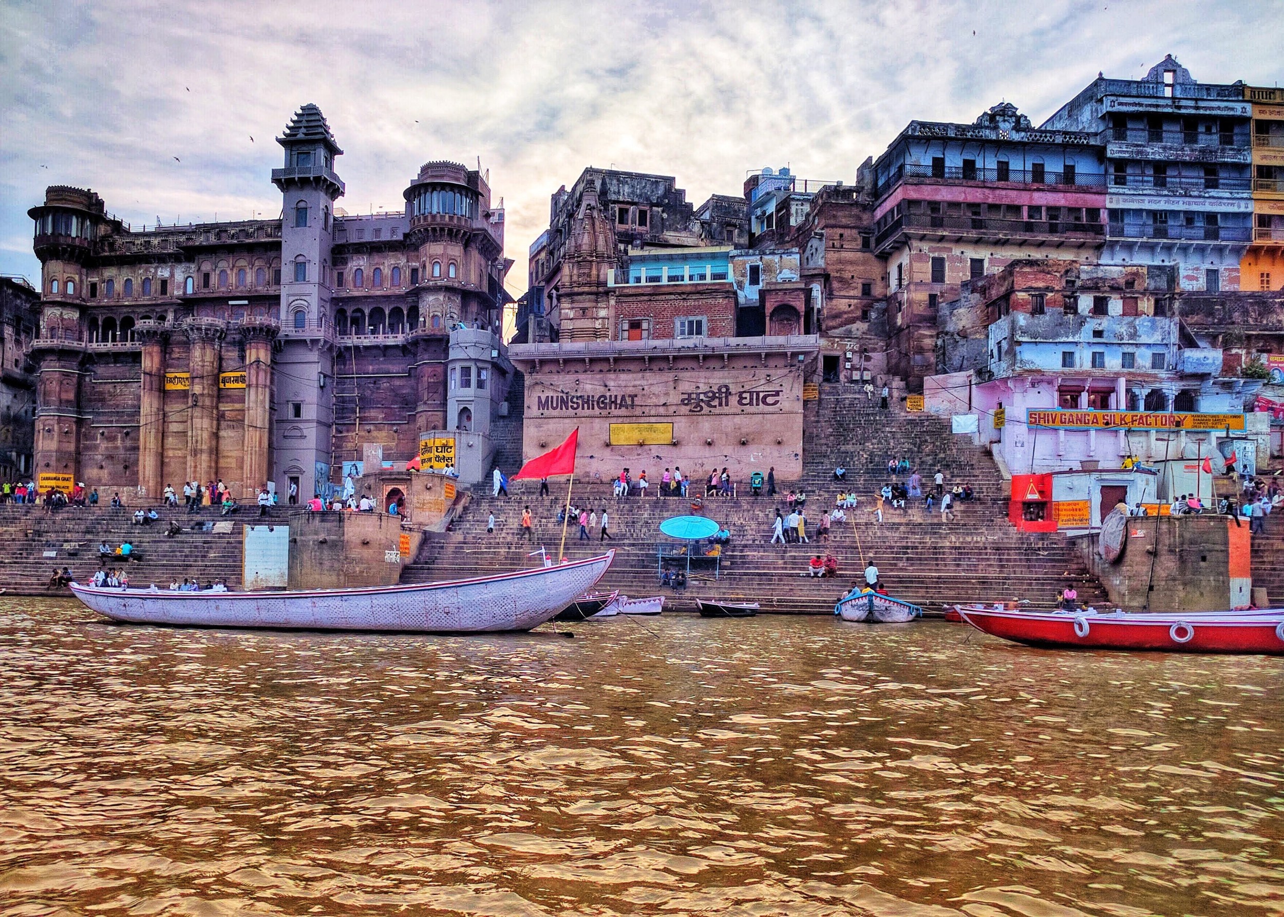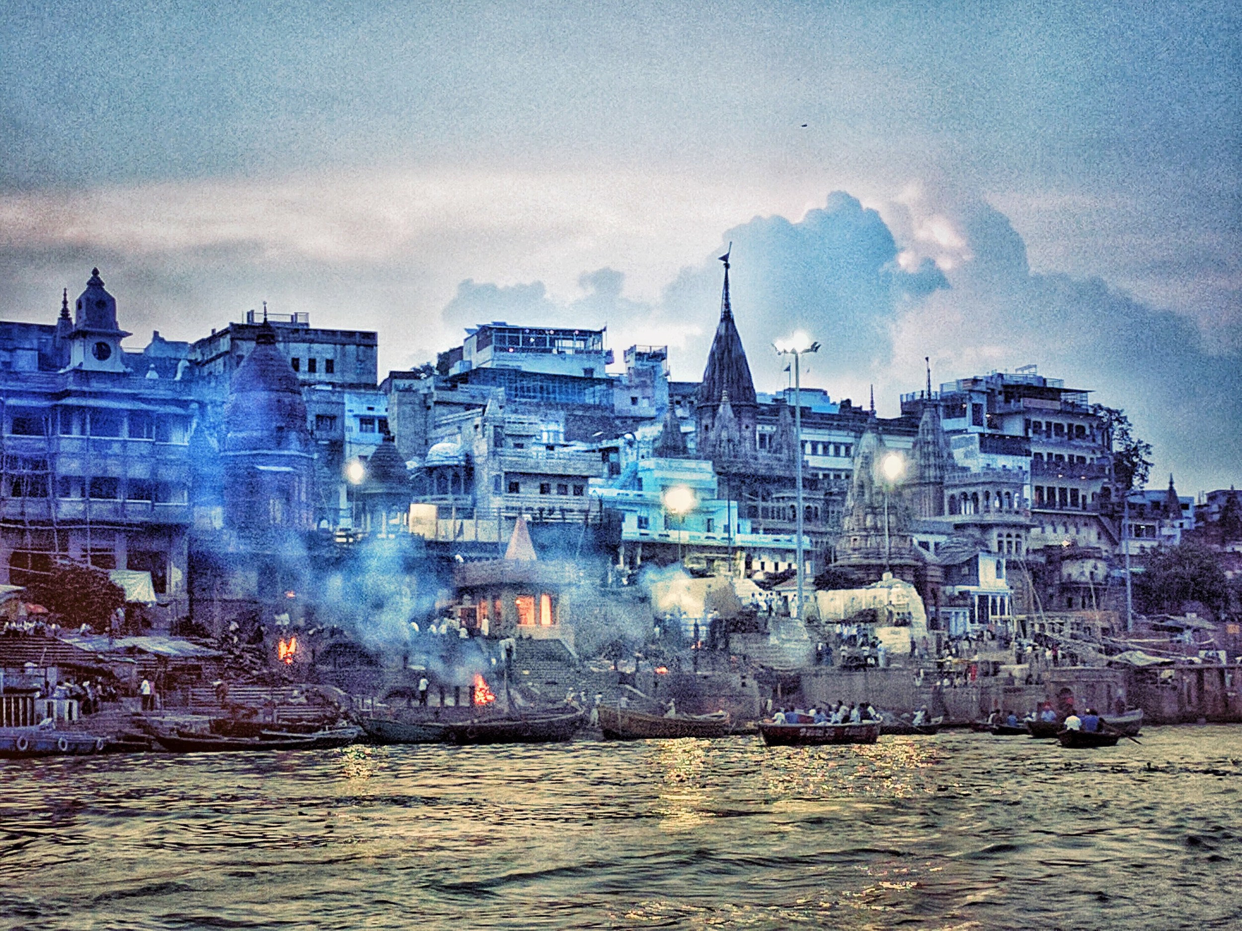 As we reached the middle, the wind began to blow & the sky became clear. None of us could hear each other audibly well, but we could hear the flowing water. To our right, were the ghats. All of those were crowded with families, solo travellers & priests. I saw flames coming out of Manikarnika Ghat & searched on Google if it’s what I think it means. They say that if you die in Kashi, you don’t take a rebirth. No reincarnations. Your soul is free, forever. This is why, many come to Varanasi in their last moments, and spend the last stage of their life in a holy place like this, with only time to think over the life they had, and the life they could have had. And then wither away in flames on Manikarnika or Harishchandra ghat.